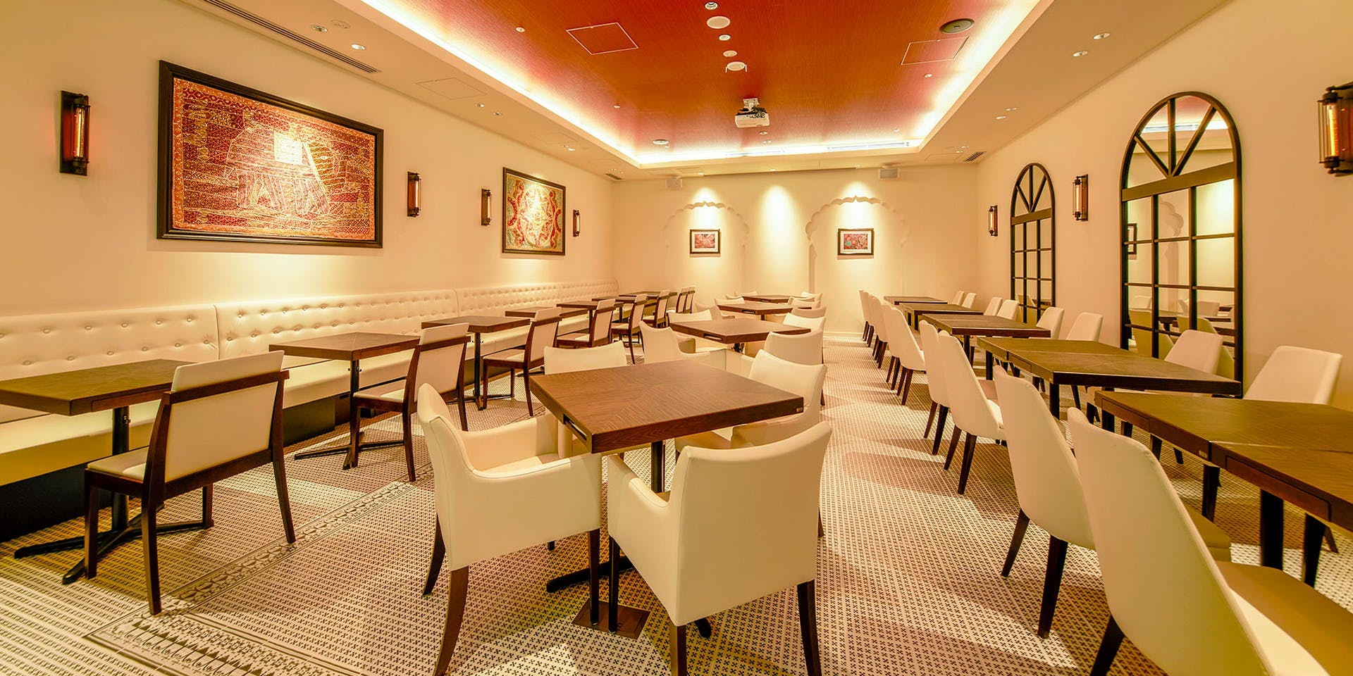 “ART&RICH”をデザインコンセプトとし、気品のあるボルドーカラーを基調としたフォーマルで華やかな店内。